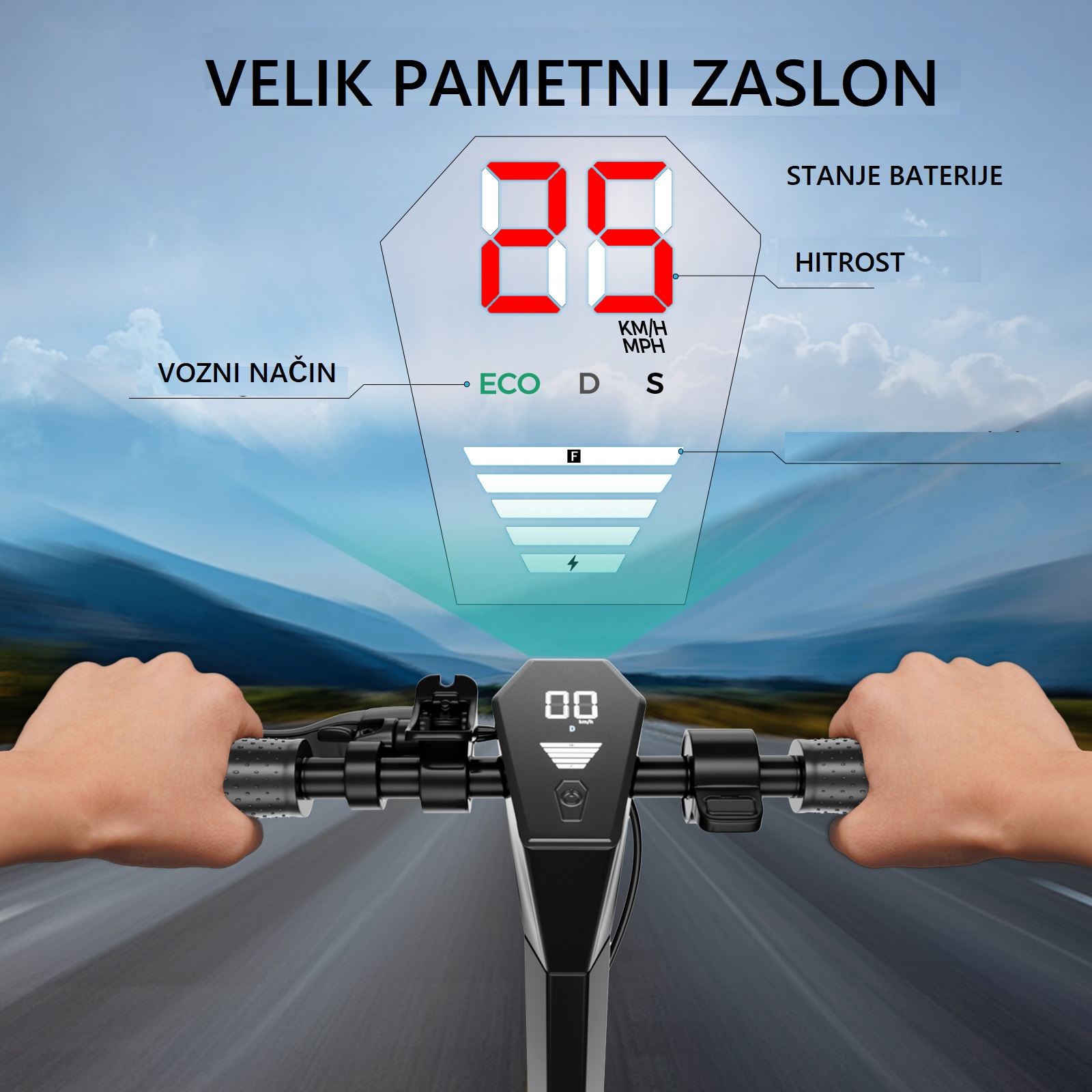 Električni skiro OOTEK V10 je opremljen z sredinsko nameščenim LCD zaslonom, ki omogoča enostaven pregled do ključnih inforamcij med vožnjo. Zaslon je zasnovan za optimalno vidljivost v vseh svetlobnih pogojih, kar zagotavlja varno in udobno vožnjo podnevi in ponoči.